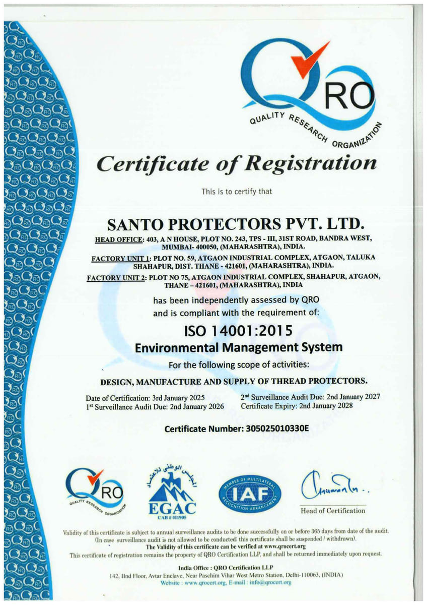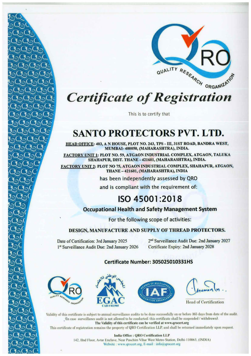 SANTO’s products are manufactured at its “own”, ISO 9001-2015 certified “State of the Art “ manufacturing facility located at Mumbai / India . SANTO’s facility is equipped with latest PLC / CNC Machines and all the other machines required for In- situ testing of Protectors to meet Thread Protectors Design Validation requirements stipulated under Annex I of API 5CT, latest edition .