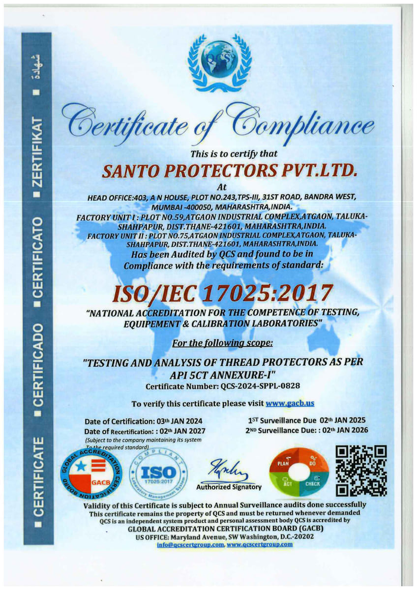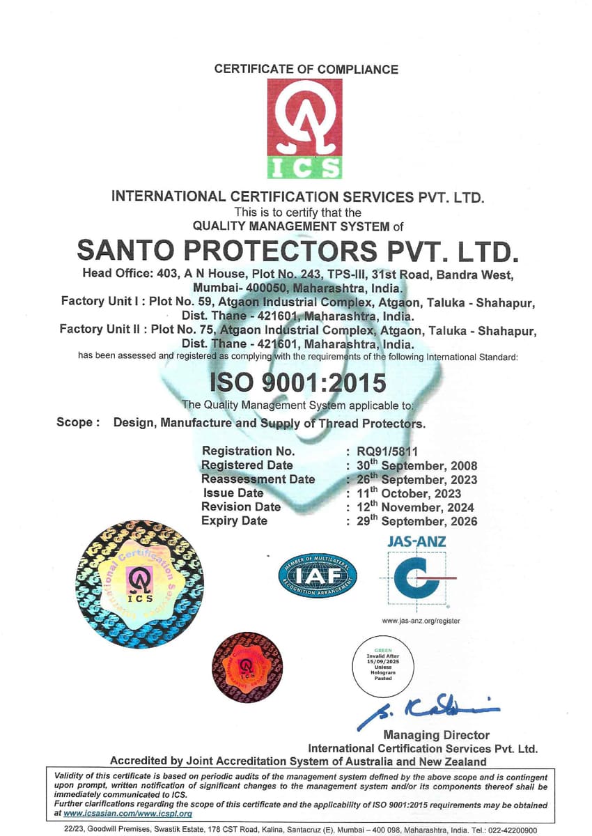 SANTO’s products are manufactured at its “own”, ISO 9001-2015 certified “State of the Art “ manufacturing facility located at Mumbai / India . SANTO’s facility is equipped with latest PLC / CNC Machines and all the other machines required for In- situ testing of Protectors to meet Thread Protectors Design Validation requirements stipulated under Annex I of API 5CT, latest edition .
