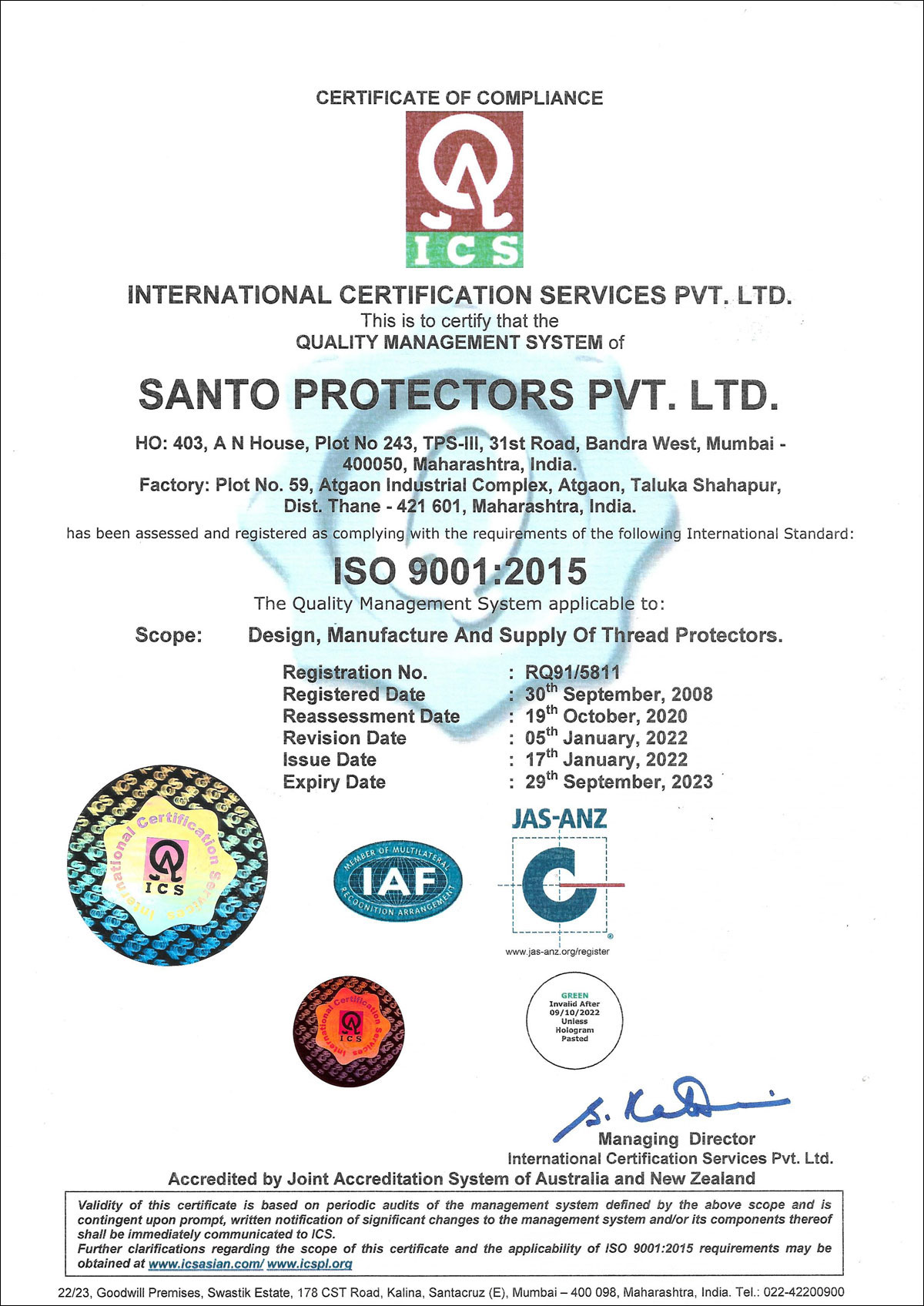 SANTO Thread Protectors are designed , engineered , validated and produced to ensure compliance with thread protection requirements stipulated under API Specifications 5CT ( latest edition ) and also the specifications / standards laid down by proprietary manufacturers of Oil Well Tubulars.